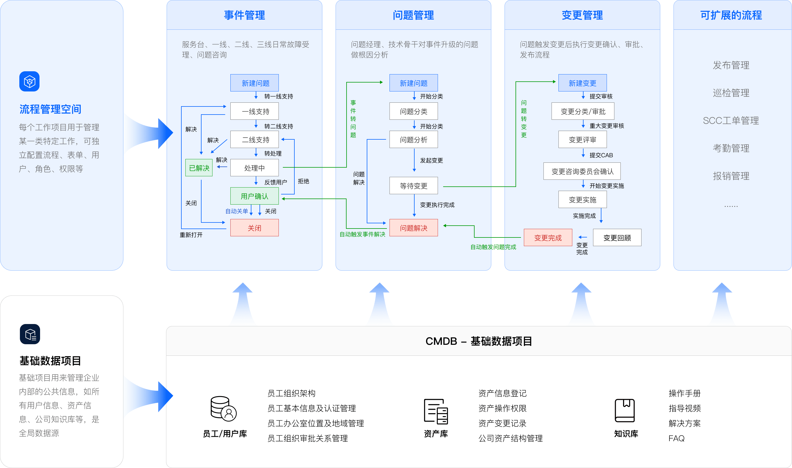 通过端到端标注化流程和全生命周期管理,系统协调人、流程、技术、精准匹配IT服务与业务需求。涵盖事件管理(快速恢复)、问题管理(根因分析)、变更管理(风险控)、服务请求(自动化)、配置管理(透明可视)、服务水平协议(动态监控)。